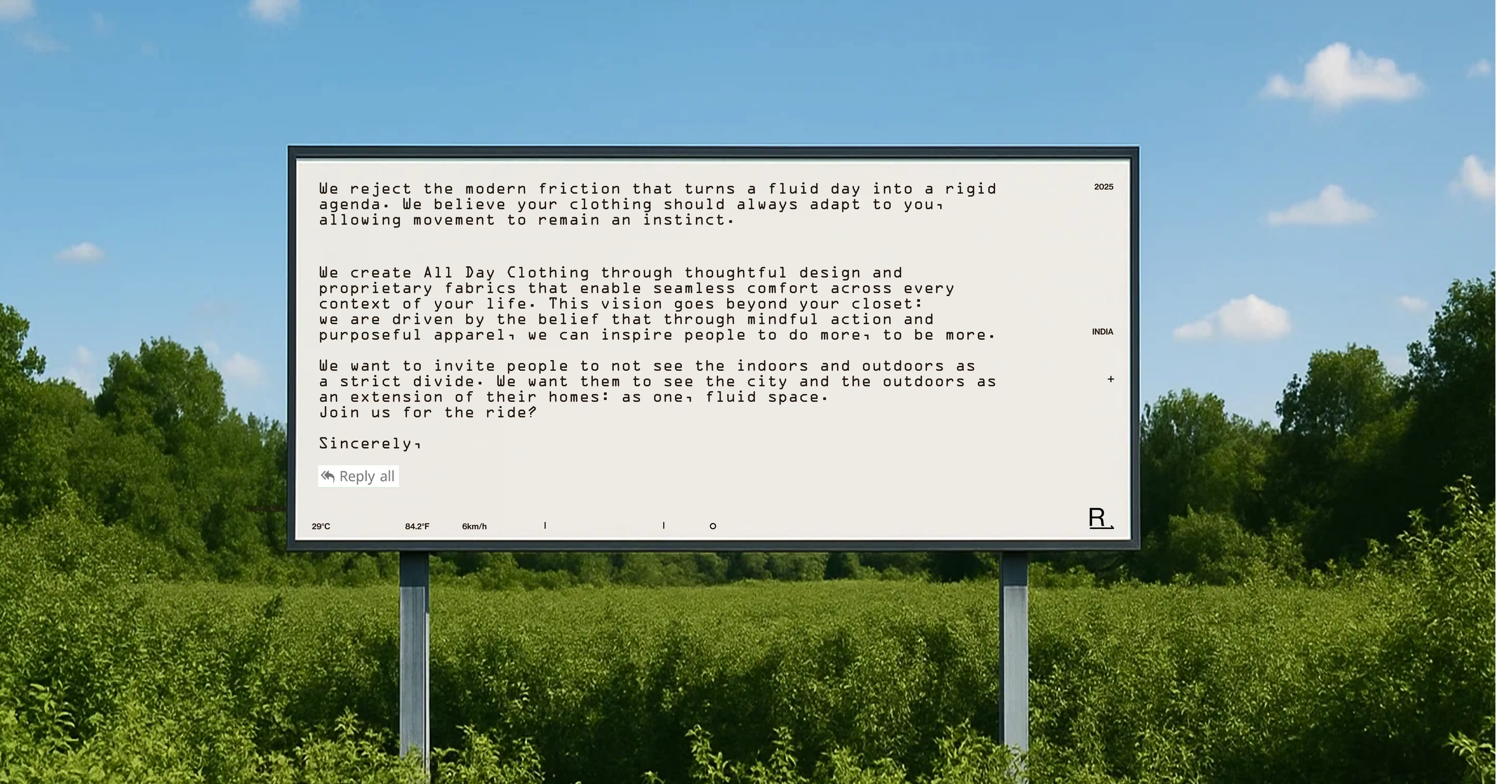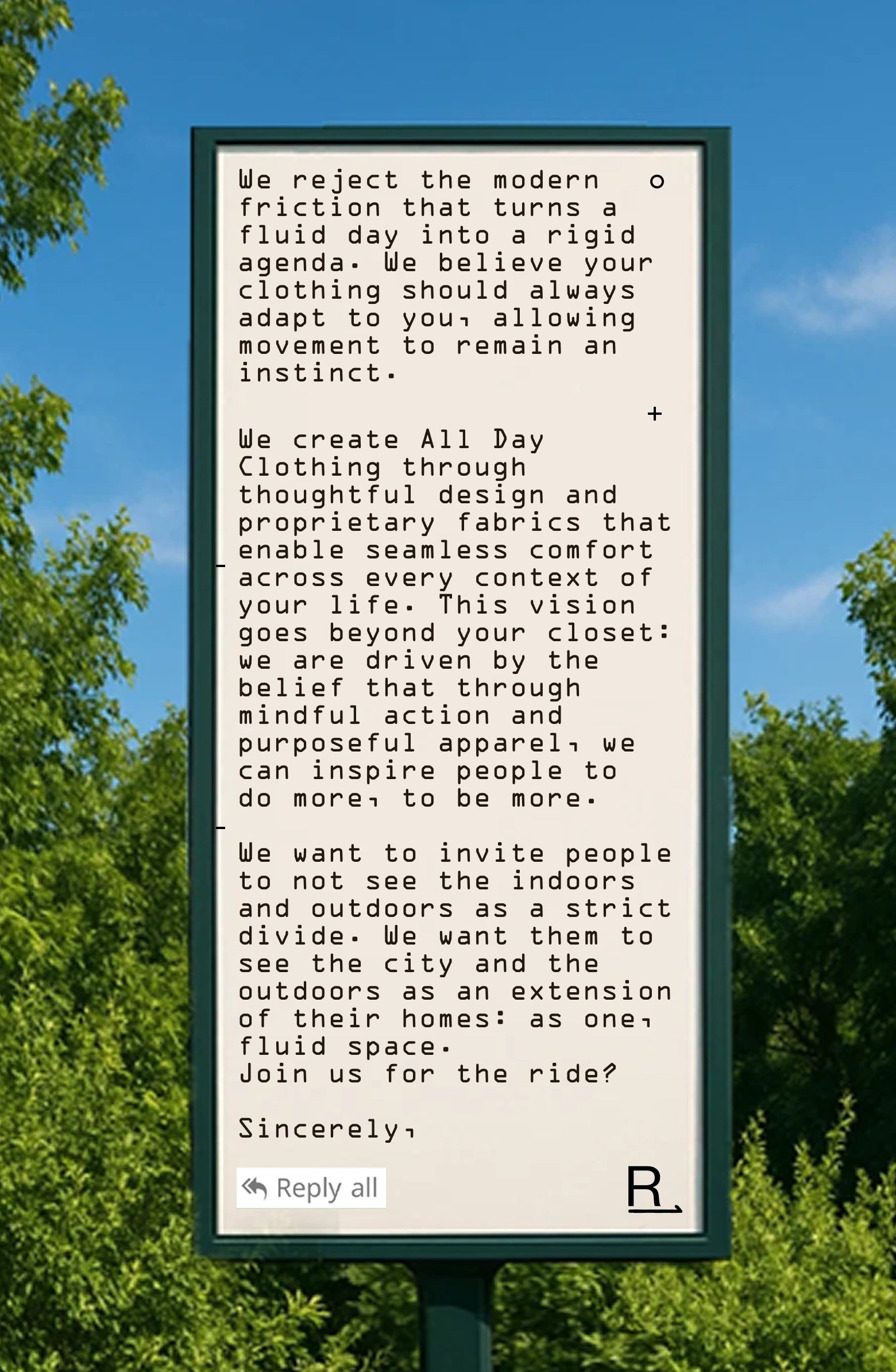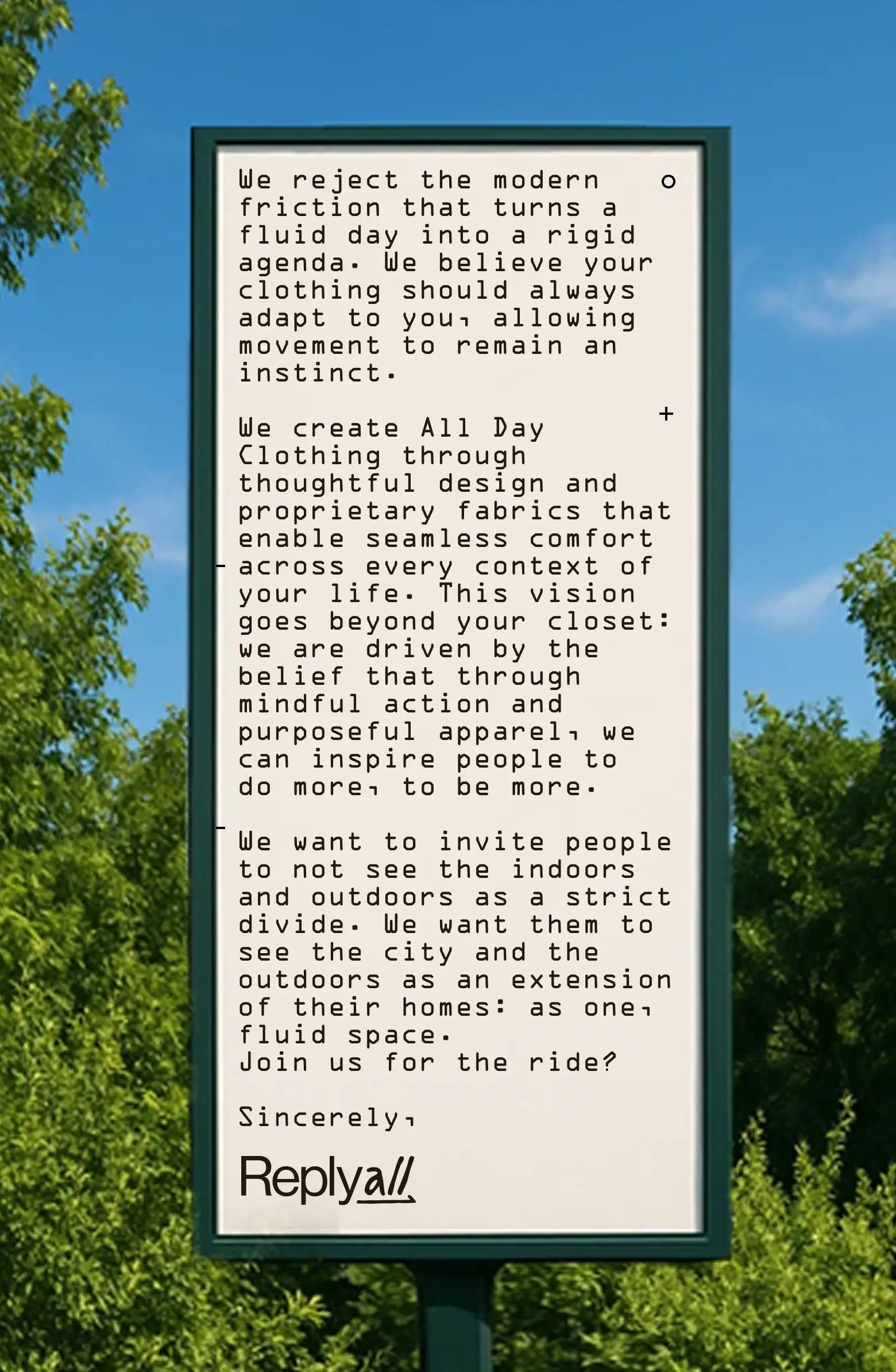 Built for commutes, coffee runs, long hauls, and last calls. Designed for the continuum. Reply All is inspired by urban lives in motion. Built for the full spectrum of your day—highs, lows, and the in-between. Functional, stylish, effortless, ready to wear all day.